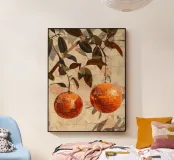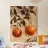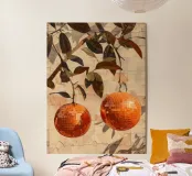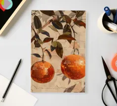 Una composizione giocosa ma raffinata con due arance trasformate in sfere da discoteca, appese a un ramo frondoso su uno sfondo di muro leggermente consumato dal tempo. Toni caldi, riflessi delicati e texture naturali creano un contrasto equilibrato tra forme organiche e scintillio grafico. Un'opera d'arte contemporanea che aggiunge umorismo, calore e interesse visivo agli interni moderni.