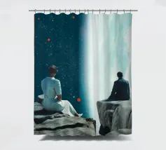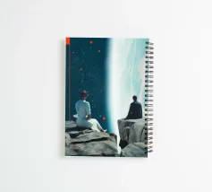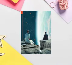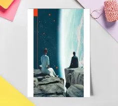 Un collage digitale surreale che mostra un uomo e una donna seduti su scogliere separate, l'uno di fronte all'altra ma divisi da un bordo planetario incandescente. Lei indossa un abito bianco, lui un vestito scuro. Lo spazio tra loro è pieno di stelle e punti rossi fluttuanti. Il silenzio, la distanza e la separazione sono al centro della scena.