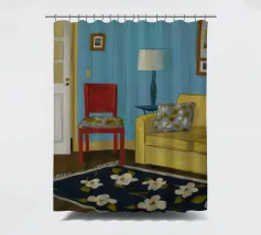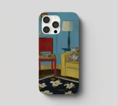 Una scena d'interni con un comodo divano giallo in una stanza con pareti blu e un tappeto a motivi scuri. La combinazione di colori è rilassante e allegra e crea uno spazio abitativo rilassato ed elegante.