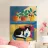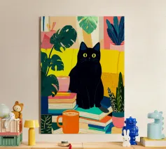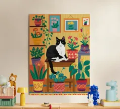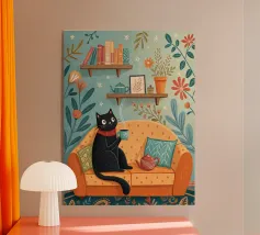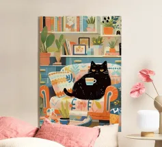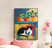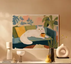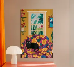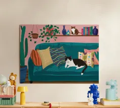 Un'illustrazione affascinante e accogliente di un gatto "smoking" bianco e nero che dorme pacificamente su un divano giallo, circondato da piante in vaso. L'opera d'arte cattura la gioia semplice e tranquilla di un pisolino.