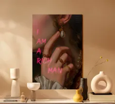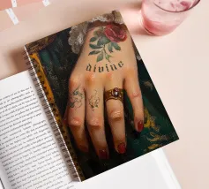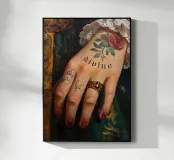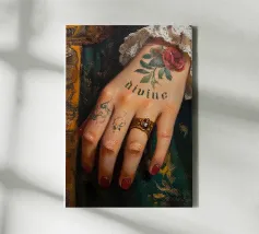 "Questo pezzo fonde l'opulenza dello stile barocco con un tocco audace e moderno, concentrandosi su un primo piano della mano di una donna, elegantemente vestita con gli abiti lussuosi di una grande festa dell'epoca. Ma la sorpresa sta nella sua pelle: un tatuaggio contemporaneo che spicca, aggiungendo un senso di emancipazione femminile. Il contrasto tra la delicatezza barocca e il simbolismo moderno del tatuaggio ritrae una donna sensuale, raffinata e sicura di sé, fondendo il classico con il suggestivo in un'immagine di grande impatto".