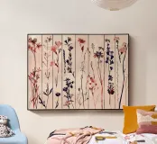 Alti fiori di campo si ergono in morbide colonne, ognuna separata da linee sottili come esemplari pressati in un gabinetto di curiosità. La tavolozza di colori cremisi e blu inchiostro conferisce modernità a un'atmosfera delicata e d'archivio, fondendo la struttura con la crescita organica.