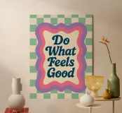 Morbidi quadretti verde acqua e lilla si incontrano con una cornice ondulata e una citazione che dà forza. Questa stampa irradia amore per se stessi e libertà, perfetta per camere da letto, studi creativi o spazi dedicati alla cura di sé.
