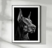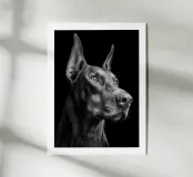 Ritratto fotografico in bianco e nero di un Dobermann con sguardo penetrante, orecchie erette e pelo corto, valorizzato dall'illuminazione in studio. Lo sfondo nero profondo esalta il contrasto e mette in risalto le linee eleganti del muso. Un poster forte e moderno per valorizzare qualsiasi salotto, ufficio, corridoio o spazio minimalista. Ideale per gli amanti dei cani e per una decorazione grafica da parete sobria, potente e senza tempo.