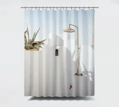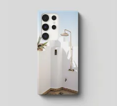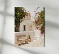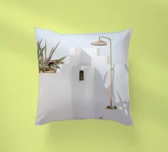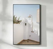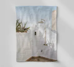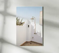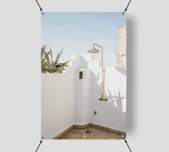 Fuggite in un paradiso bohémien con questa splendida fotografia di una doccia esterna bianca su un tetto illuminato dal sole di Marrakech. Il design minimalista, con le sue linee pulite e le texture naturali, si fonde perfettamente con il caldo sole marocchino, creando un'oasi di tranquillità sopra la città. Circondato da pareti bianche e piastrelle in terracotta e da una leggera brezza, questo spazio sereno evoca un senso di libertà e relax. Ideale per infondere alla vostra casa l'eleganza rilassata dello stile marocchino, questa immagine cattura la bellezza della vita all'aperto e lo spirito del fascino senza tempo di Marrakech.