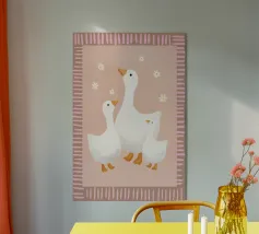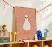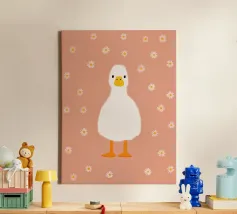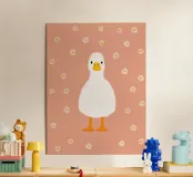 Questa affascinante illustrazione raffigura una semplice anatra bianca che posa tranquillamente su uno sfondo color terracotta, circondata da delicate margherite sparse. Con la sua forma morbida e arrotondata, i piccoli occhi neri e il becco e le zampe giallo dorato, l'anatra ha un aspetto accattivante e gentile. Perfetta per camerette, camere da letto dei bambini o spazi in stile cottage, questa stampa dona calore, dolcezza e un tocco di fascino campestre a qualsiasi parete. Un regalo adorabile per gli amanti degli animali o per chiunque ami gli arredi morbidi e senza tempo per bambini.