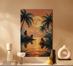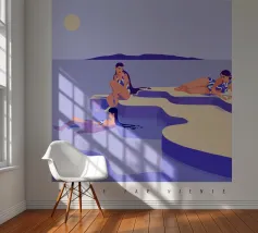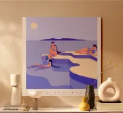 Dolce Far Niente cattura la beata arte del dolce far niente, la celebrazione del tempo libero e della tranquillità. In un paesaggio minimalista, quest'opera d'arte ritrae donne immerse in momenti sereni di nuoto, ozio e semplice esistenza. Le linee pulite e le forme organiche evocano la bellezza senza tempo della natura, mentre la semplicità della composizione sottolinea la gioia di rallentare ed essere presenti. La tavolozza dei colori, tenue ma ricca, rispecchia l'equilibrio tra calma e vitalità, invitando gli spettatori ad abbracciare il lusso della pausa e della connessione con se stessi.