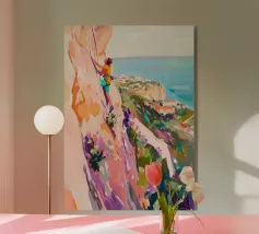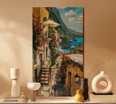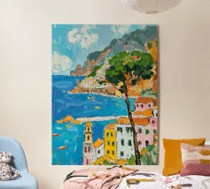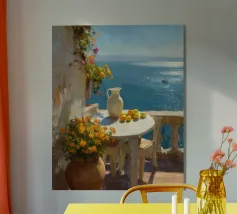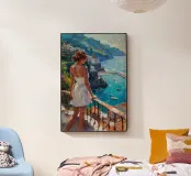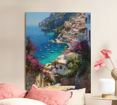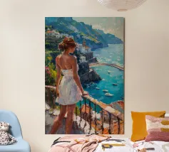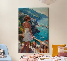 Una veduta illuminata dal sole della Costiera Amalfitana con una donna in abito bianco che guarda il mare da una terrazza rustica. Le pennellate catturano il calore dell'estate italiana, il turchese vivido dell'acqua punteggiata di barche e l'eleganza romantica del fascino mediterraneo. Un momento sospeso tra bellezza e sogno ad occhi aperti.