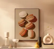 Questa elegante illustrazione di dolci macarons nei toni morbidi del beige e del marrone dona un tocco di pasticceria francese a qualsiasi cucina moderna. Ideale per gli amanti dei dolci e dell'arte minimalista.