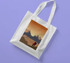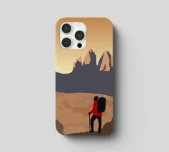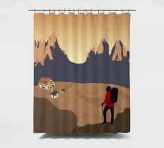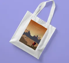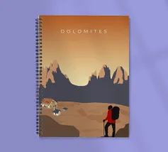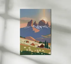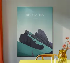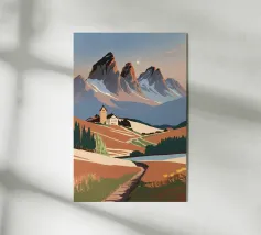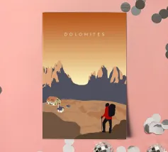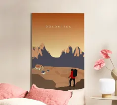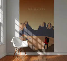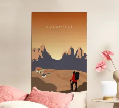 Design da viaggio minimalista delle Tre Cime, di un escursionista e di un noto rifugio nelle Dolomiti, che si trovano nella parte italiana delle Alpi e sono una destinazione di vacanza popolare per gli escursionisti e gli alpinisti.