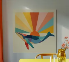 Enjoy a vibrant ocean illustration featuring a dolphin leaping in front of a colorful sunset. With bold colors and a unique design, this artwork will bring a touch of the sea and artistic flair to your space.