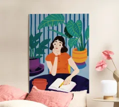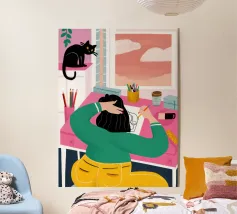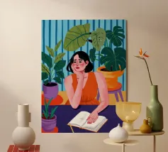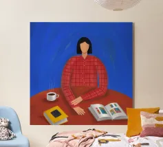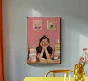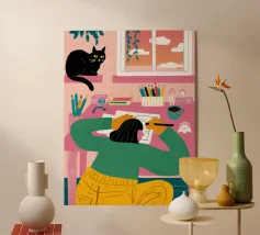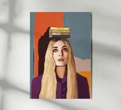 Un ritratto moderno e stravagante di una donna persa nei suoi pensieri, circondata da alte pile di libri e calde tazze di caffè, con un libro appollaiato giocosamente in cima alla testa. Su uno sfondo rosa tenue con allegre stampe incorniciate, questo pezzo cattura l'essenza del sogno a occhi aperti, della fatica dello studio e del delicato equilibrio tra procrastinazione e produttività. Ideale per gli amanti dei libri, per gli spazi accoglienti e per tutti coloro che trovano la magia nei momenti intermedi.