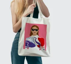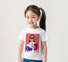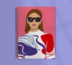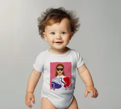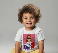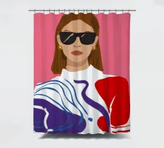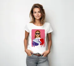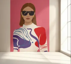 Ritratto di moda di una donna chic con occhiali da sole rosa, che indossa un top stilizzato con motivi rossi e blu. Lo stile è moderno, audace e grafico.
