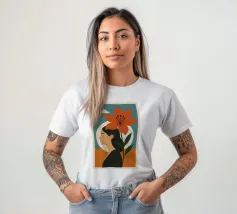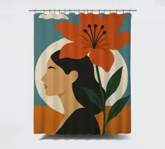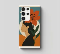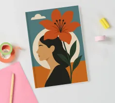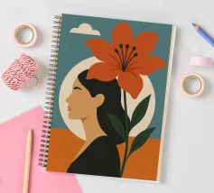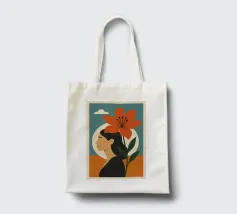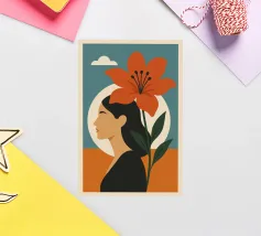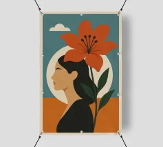 Una rappresentazione grafica in formato ritratto mostra il profilo stilizzato di una donna i cui capelli sono mossi dal vento. Un grande fiore si dispiega accanto a lei, mentre il cielo si posa in morbide sfumature di colore sullo sfondo. Il design combina espressione femminile, vicinanza alla natura e leggerezza sognante in uno stile moderno e minimalista.