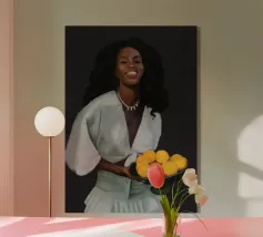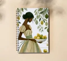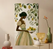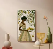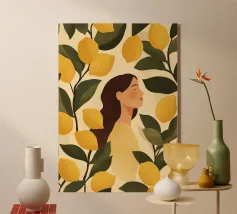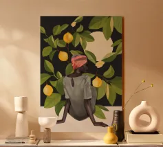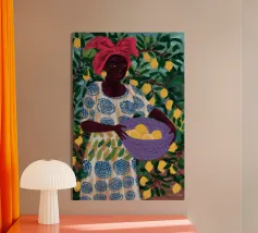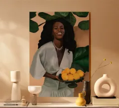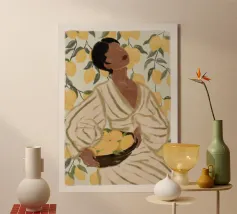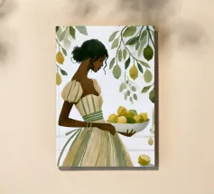 Portate calore e tranquillità in ogni spazio con questa elegante illustrazione ad acquerello, che cattura una scena serena di ispirazione mediterranea. L'opera presenta una donna dalla pelle scura che indossa un morbido abito a righe beige e verdi e tiene in mano una ciotola piena di limoni sullo sfondo di rigogliosi rami di limone. I toni morbidi e stratificati e i dettagli minimi creano un'atmosfera rilassante e naturale, rendendola un'aggiunta ideale all'arredamento di qualsiasi stanza. Perfetto per chi ama i toni della terra e la bellezza senza tempo, questo pezzo evoca un senso di pomeriggi tranquilli e soleggiati.