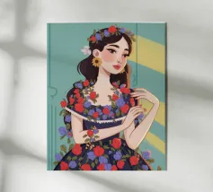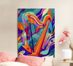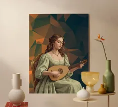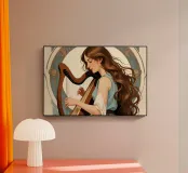 Una giovane donna dai lunghi capelli castani di epoca romana suona un'arpa su uno sfondo decorato con fiori stilizzati disegnati.