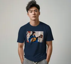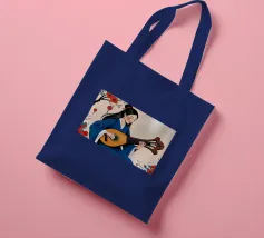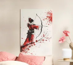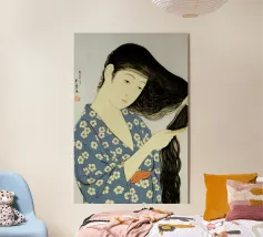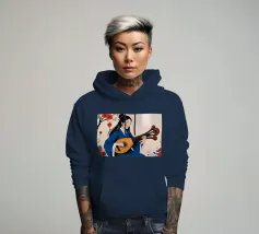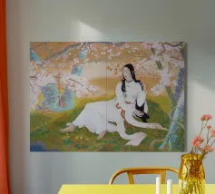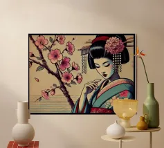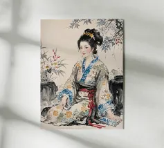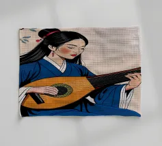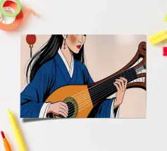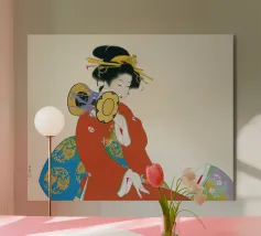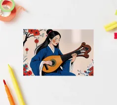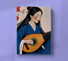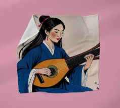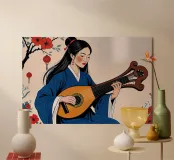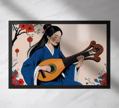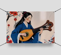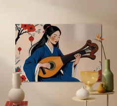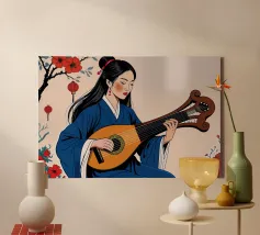 Giovane donna orientale in kimono blu suona un liuto seduta tra fiori e lanterne rosse.