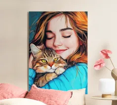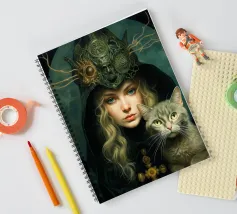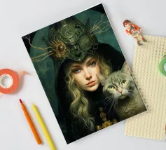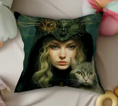 Misteriosa bella donna con gatto. Arte digitale.