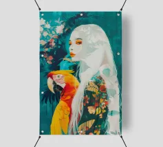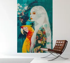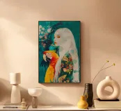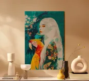 Questa composizione magico-realistica fonde il simbolismo tropicale di Frida Kahlo con l'arte digitale contemporanea. L'eterea protagonista diventa una moderna dea della giungla, mentre la magnifica ara funge da compagna spirituale. Gli strati di colore turchese ricordano i dipinti delle piscine di Hockney, ma creano anche un misticismo puro ed esotico. Quest'opera d'arte è un portale ipnotico tra sogno e realtà, ideale per gli amanti della bellezza surreale unita al lusso botanico. Un pezzo unico e inconfondibile che non abbandona mai lo sguardo.