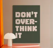 Un design minimalista con un gomitolo aggrovigliato di fili colorati che si dipana lentamente in una linea retta. La frase "Don't Overthink It" (Non pensarci troppo) è riportata in una tipografia pulita e moderna, che sfuma delicatamente dal grassetto alla luce per riflettere la calma chiarezza. Lo sfondo sereno in tenui toni pastello esalta il messaggio di semplicità e abbandono.