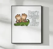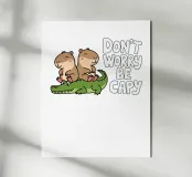 Due simpatici capibara siedono pacificamente su un coccodrillo verde, con accanto la frase scherzosa "Don't Worry Be Capy".