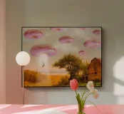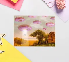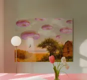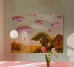 "Donut invasion combina la serenità di un paesaggio ad olio con elementi di fantascienza, utilizzando la tecnica del collage per aggiungere un tocco umoristico includendo le ciambelle come astronavi. Quest'opera invita lo spettatore a godere di una sorprendente miscela di tradizionale e futuristico, suscitando un sorriso mentre contempla questa curiosa trasformazione".