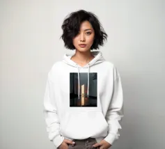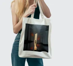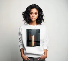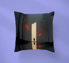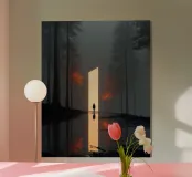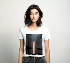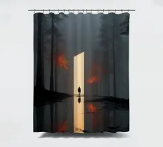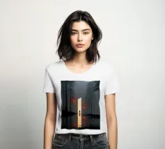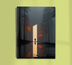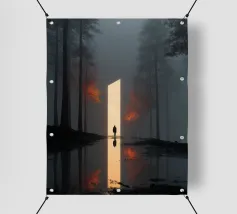 Una scena cinematografica inquietante, in cui il mondo naturale incontra una geometria impossibile. Una figura solitaria si erge davanti a un imponente piano di luce, che attraversa una foresta avvolta dalla nebbia come una porta tra due realtà. Le scure linee verticali degli alberi incorniciano il bagliore, mentre i riflessi nell'acqua sottostante raddoppiano il senso di simmetria, silenzio e attesa.