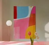 Un'audace ed energica composizione astratta infusa di colori dopaminergici: rosa elettrico, arancione citrus, blu oceano e giallo limone si scontrano in forme fluide e organiche. Questo gioioso pezzo porta una vibrante energia pop-art in qualsiasi interno moderno. Perfetto per chi desidera una terapia del colore e un'arte da parete di grande effetto.