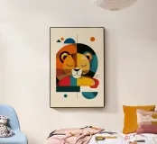 Un pacifico cucciolo di leone sonnecchia sotto un cielo di ispirazione Bauhaus, avvolto da vivaci blocchi di rosso, blu, giallo e arancione. Questa composizione audace ma serena è un ponte tra il mondo del design astratto e la dolcezza delle emozioni, ed è un pezzo perfetto per le camerette, le stanze da gioco o gli spazi per bambini dal design ricercato.
