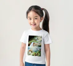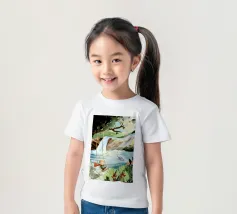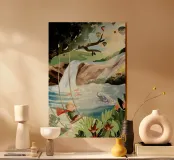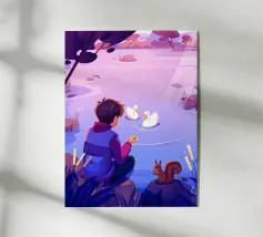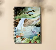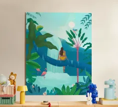 Questo mondo dei sogni è un must per ogni stanza o angolo dei bambini! Colorato, pieno di fantasia e, naturalmente, sognante! Piante e animali tropicali in un bellissimo paesaggio con alberi, fiori e una cascata, e il protagonista di questa stampa: un ragazzo con un mantello sull'altalena.