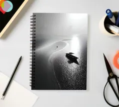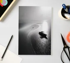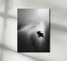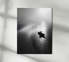 Una serena fotografia in bianco e nero di una piccola barca che galleggia su acque calme. La luce soffusa e la composizione minimalista evocano quiete, spazio e tranquilla riflessione.
