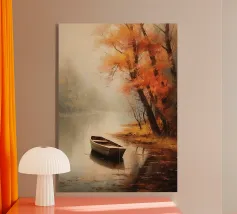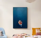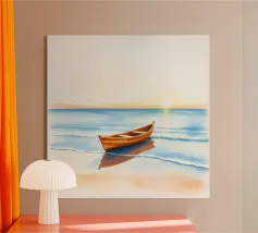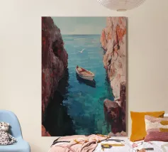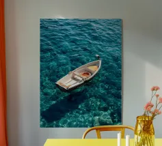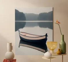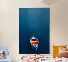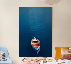 Una barca solitaria galleggia dolcemente sull'acqua calma e blu profondo, la sua quiete riflessiva interrotta solo dalle morbide increspature. Circondata da uno spazio infinito, la barca evoca sentimenti di pace e solitudine, catturati con pennellate morbide e colori ricchi e sereni.