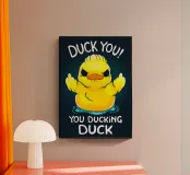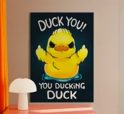 L'opera d'arte intitolata "I Don't a Duck" mostra un'atmosfera surreale e assurdamente umoristica che combina giochi di parole ed elementi visivi. Con uno stile di illustrazione minimalista e un approccio ironico al design, l'opera emana un senso di confusione. La stessa frase "Duck You" è al centro dell'attenzione e implica la negazione o la falsità dell'esistenza di un'anatra, il che aggiunge strati di significato e invita alla risata. Questo stile si inserisce nelle tendenze digitali dell'assurdismo, della cultura dei meme e del design sperimentale che si prendono gioco della logica quotidiana in forme visive uniche e fantasiose.
