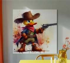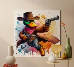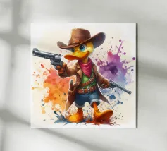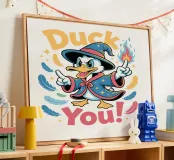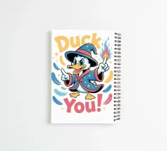 Un papero dei cartoni animati vestito da mago si erge trionfante, circondato da piume colorate e lanciando un incantesimo infuocato con una mano. Il testo "Duck You!" aggiunge un tono umoristico e giocoso alla composizione.