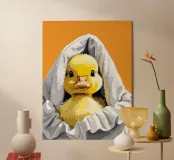 Un simpatico anatroccolo fa capolino da sotto un morbido asciugamano bianco. Le sue soffici piume gialle e i suoi occhi curiosi creano una scena adorabile e affascinante.