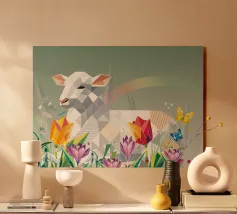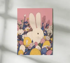 Due coniglietti pasquali stilizzati tra fiori colorati, pulcini e farfalle: un motivo allegro in stile poligonale, ideale per il periodo pasquale e l'inizio della primavera. Due coniglietti geometrici come motivo centrale Fiori primaverili colorati e crochi Inclusi simpatici pulcini e farfalle svolazzanti Design moderno e giocoso per la Pasqua Ideale per prodotti stagionali dal sapore primaverile