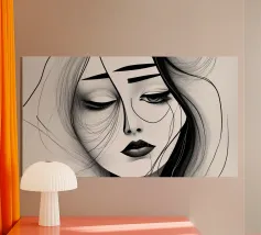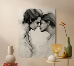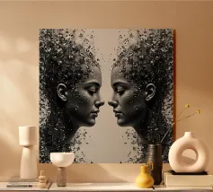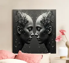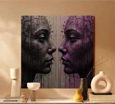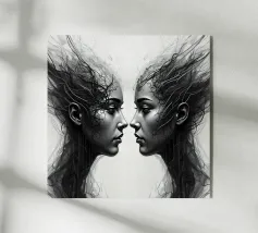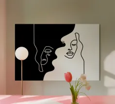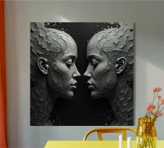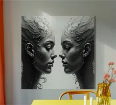 Due eleganti volti di profilo che mostrano un'intricata line art. plexiglass