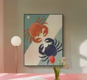Allegra illustrazione con due granchi dai colori diversi che interagiscono, irradiando lo spirito di una vita marina unica e interessante.