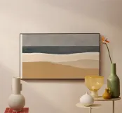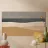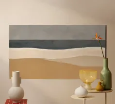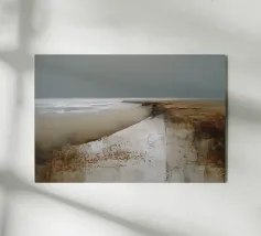 Le sabbie color ocra incontrano le morbide onde color avorio sotto un cielo grigio tenue in questa composizione costiera minimalista. Pennellate larghe e piatte creano un equilibrio sereno tra terra, mare e cielo.