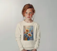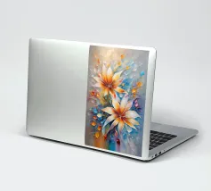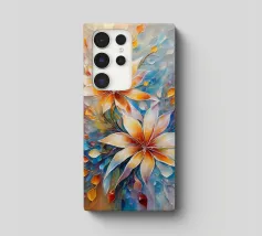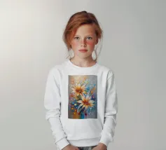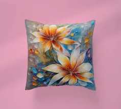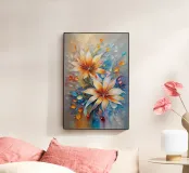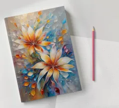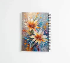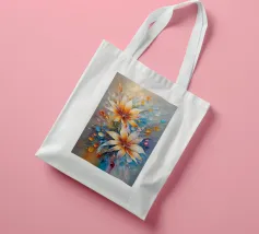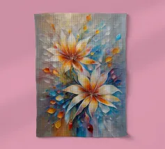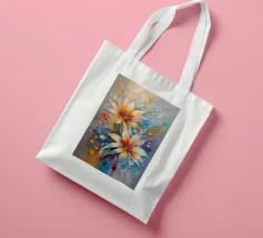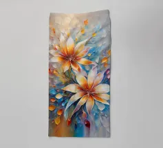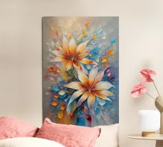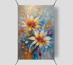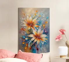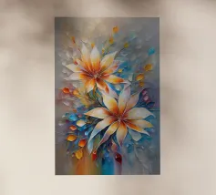 Questo dipinto vibrante e accattivante mostra una splendida coppia di radiosi fiori bianchi, i cui petali sono delicatamente ornati da accenni di arancione e giallo. Gli intricati dettagli testuali creano una profondità ipnotica, mentre le tonalità blu e verdi circostanti creano un contrasto armonioso. Quest'opera d'arte è perfetta per aggiungere un tocco di eleganza e colore a qualsiasi spazio interno.