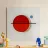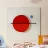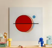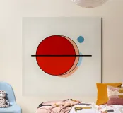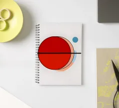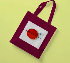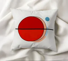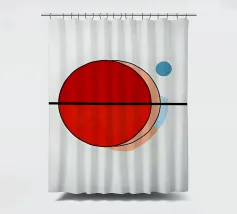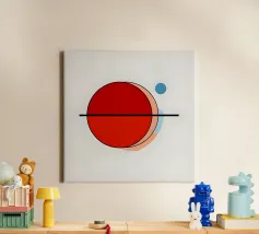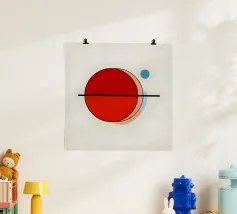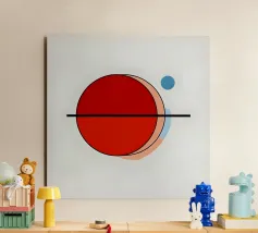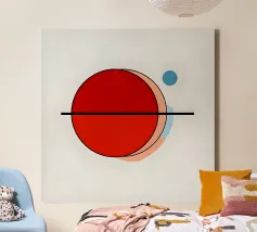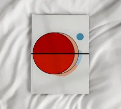 Questa immagine rigorosamente geometrica e minimalista mostra un grande cerchio centrale di colore rosso vivo, intersecato da una spessa linea nera orizzontale. Il cerchio rosso è circondato da forme sottilmente accennate e semitrasparenti in rosa chiaro e blu, che creano un senso di profondità. In alto a destra, al di fuori del cerchio principale, si trova un punto blu più piccolo e non collegato. La composizione è precisa e statica, isolata su uno sfondo neutro grigio chiaro.