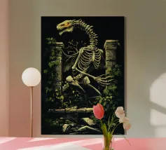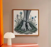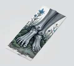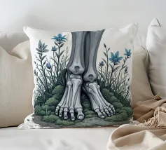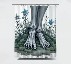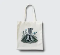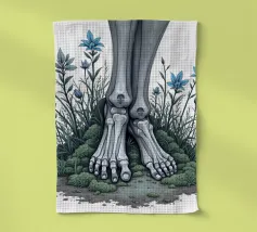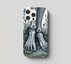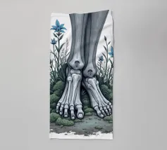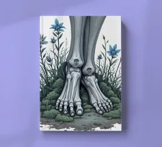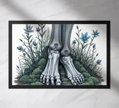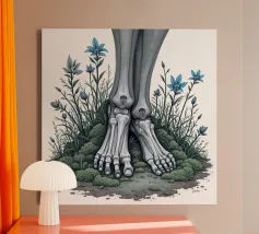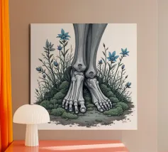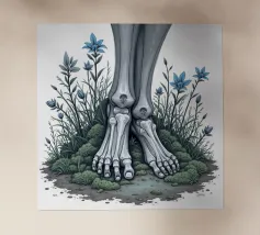 Le ossa nude incontrano la terra in un tenero abbandono. I suoi piedi - silenziosi, scheletrici - riposano nel muschio, circondati da fiori blu che non piangono, ma fioriscono. Non c'è fretta in questo finale. Non è fuggita, non è caduta. È rimasta, e la natura le è stata grata.