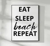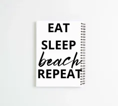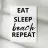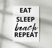 Il testo nero in grassetto su sfondo bianco recita la frase "EAT SLEEP beach REPEAT". La parola "beach" è scritta in stile corsivo, aggiungendo un tocco giocoso al design altrimenti semplice.