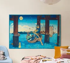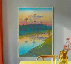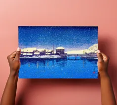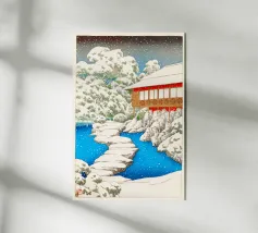 Japanese Ukiyo-e and Shin-Hanga prints, from serene landscapes by Kawase Hasui to the iconic waves of Hokusai and Hiroshige. Ukiyo-e, literally “pictures of the floating world,” is a Japanese art form that captures the beauty, elegance, and transience of everyday life. Originating in the Edo period, these woodblock prints and paintings depict landscapes, city scenes, theater, and the grace of women, blending realism with stylized design. Characterized by bold lines, harmonious color palettes, and meticulous attention to detail, Ukiyo-e celebrates the ephemeral moments of life—the shimmer of rain on a street, the curve of a mountain, the fleeting expression of a courtesan. Later, the Shin-Hanga movement revived this tradition with a modern sensibility, emphasizing light, mood, and atmosphere.