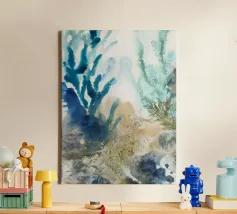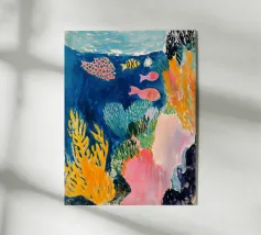 Un ricco arazzo di texture marine e sabbie mutevoli, questo acquerello cattura la sottile bellezza di un momento di marea. Piante marine traslucide e forme di corallo emergono da fondali di tonalità ocra, stratificati con blu inchiostro e fini dettagli organici. Terrestre e coinvolgente, come un ricordo del fondo dell'oceano.
