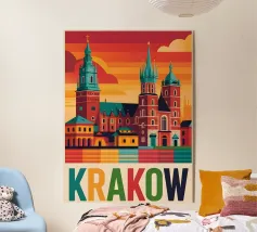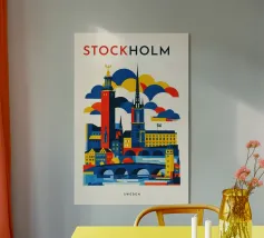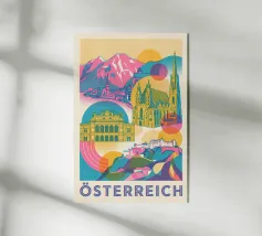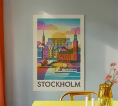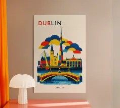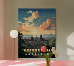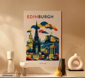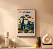 A bold, graphic celebration of Edinburgh, blending historic grandeur with contemporary design language. Iconic landmarks rise across layered hills, their silhouettes rendered in clean geometry and confident colour blocking. The composition captures the city’s dramatic skyline and sense of elevation, balancing architectural strength with a playful, modern rhythm.