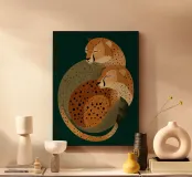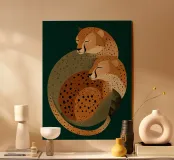 Due eleganti ghepardi si abbracciano in un'opera d'arte minimalista che celebra la loro accogliente eleganza e la bellezza della natura. I colori tenui del verde, del beige e del marrone donano un caldo sollievo a qualsiasi interno!