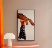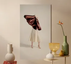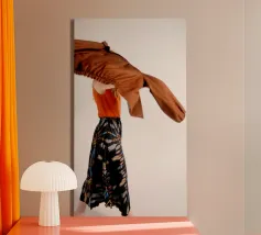 Un'immagine moderna ed elegante del movimento: un top arancione bruciato abbinato a una gonna fluida e a fantasia e un bomber in un movimento aggraziato. Questa foto fonde moda e arte, creando una dichiarazione dinamica e senza tempo, perfetta per gli interni contemporanei.