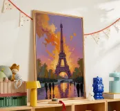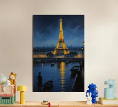 Questo affascinante dipinto a olio ritrae la Torre Eiffel mentre il sole tramonta dietro di essa, proiettando calde sfumature nel cielo. Il canale riflette i colori incandescenti, esaltando l'armoniosa composizione del dipinto. La pennellata impressionista cattura il suggestivo gioco di luci e ombre, mentre il viale di ciottoli e le strade alberate evocano una serena atmosfera parigina. Un'aggiunta perfetta a qualsiasi collezione d'arte che celebra i luoghi simbolo della Francia e il suo fascino romantico.