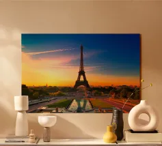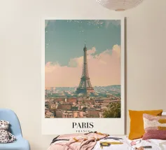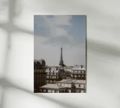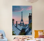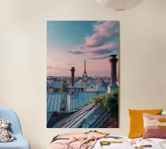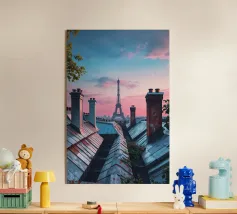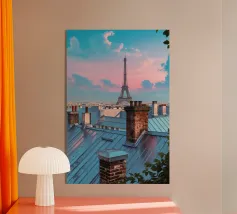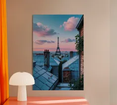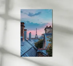 Una vista incantevole della Torre Eiffel che si erge sui tetti parigini, incorniciata da un cielo inondato dai colori tenui del crepuscolo. Il gioco di camini rustici e tetti metallici sullo sfondo pastello evidenzia la miscela unica di fascino antico ed eleganza moderna della città. Questa immagine cattura lo spirito sereno ma vibrante di Parigi, offrendo agli spettatori uno sguardo sulla bellezza quotidiana del suo paesaggio urbano. La Torre Eiffel, come elemento centrale, emana un fascino senza tempo in mezzo a un ambiente pittoresco.
